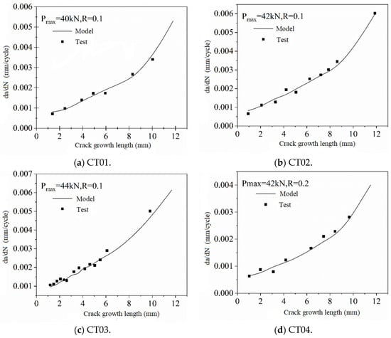 According to the fitted formula mentioned above, the variation curves of crack propagation rate with crack growth length under different loading conditions are illustrated in Figure 13.
