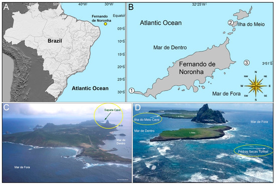 Study area. (A) Location of Fernando de Noronha Archipelago. (B) Location of the collection sites: 1, Sapata Cave. 2, Ilha do Meio Cave. 3, Pedras Secas Tunnel. (C) Aerial view of the main island of Fernando de Noronha with its two sides, the more exposed “Mar de Fora” (“Outer Sea” in Portuguese) facing southeast and the more sheltered “Mar de Dentro” (“Inner Sea” in Portuguese) facing northwest, and highlighting the location of Sapata Cave in the southwest tip of the island (arrow). (D) Aerial view of the islets on the NE side of the archipelago, highlighting the location of Ilha do Meio Cave and the direction to Pedras Secas Tunnel (arrows).