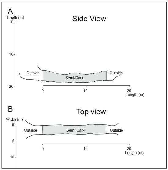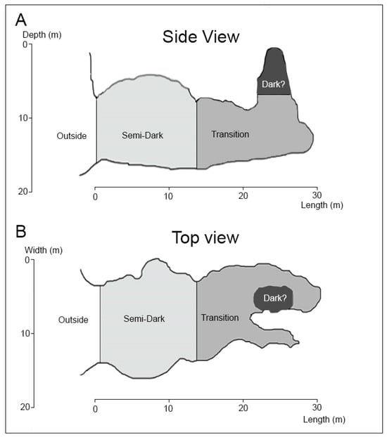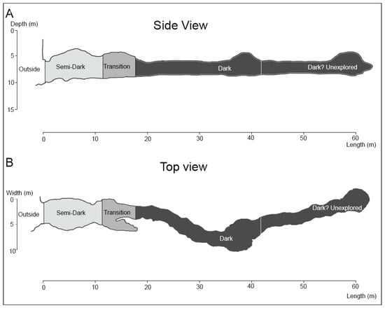 Schematic sections of Sapata Cave. (A) Lateral view. (B) Top view.
