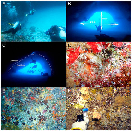 Not many organisms can adapt to survive in the environments of submarine caves. In general, the most common benthic animals in marine caves are sponges (Porifera). Due to their sessility and filtering habit, sponges can survive by feeding only on the few planktonic microorganisms available in caves. Thus, underwater caves often harbor abundant and diverse sponge communities [9,14,15]. In general, sponge species from submarine caves are different from those inhabiting adjacent rocky shores. For example, many species of the classes Homoscleromorpha and Calcarea are often more abundant in caves and other cryptic environments than on illuminated reefs and rocky shores [6,16]. Furthermore, cave sponges often comprise taxa that are rare nowadays, but were abundant in past eras [17,18]. These relics of prehistoric fauna, including sponges with desmas (formerly “Order Lithistida”) and sponges with a hypercalcified skeleton such as Sphinctozoa, Pharetronida, and Chaetetida [16,19,20,21], are of great interest to taxonomists and paleontologists. Thus, studies on cave-dwelling sponges can greatly expand the current knowledge about the diversity, biology, and evolution of animals.