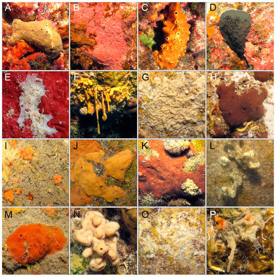 In situ photographs of representative sponge species living inside and outside Ilha do Meio Cave. (A–C) Outside the cave, in shadowy habitats under overhangs: (A) Agelas dispar (brown) and Ircinia strobilina (grey). (B) Monanchora arbuscula (pink) and Clathrina insularis (yellow). (C) Plakortis angulospiculatus. (D–L) Semi-dark zone: (D) Ascandra sp. (E) Oscarella cf. zoranja. (F) Plakortis insularis. (G) Plakinastrella microspiculifera. (H) Plakinastrella sp. (I) Oceanapia sp. (J) Dercitus (Stoeba) latex. (K) Xestospongia sp. (L) Neopetrosia sp. (M,N) Transition zone: (M) Gastrophanella cavernicola. (N) Plakortis sp. (O,P) Dark zone: (O) Spirastrella hartmani. (P) Diplastrella megastellata.