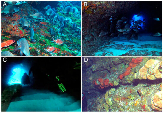 Pedras Secas Tunnel. (A) Rocky bottom outside the tunnel with abundant fish, green algae, and sponges. (B,C) General views of the tunnel. (D) Wall in the semi-dark zone at the middle of the tunnel, dominated by the sponges Plakortis angulospiculatus (brown), Agelas dispar (light brown), and Agelas clathrodes (orange).