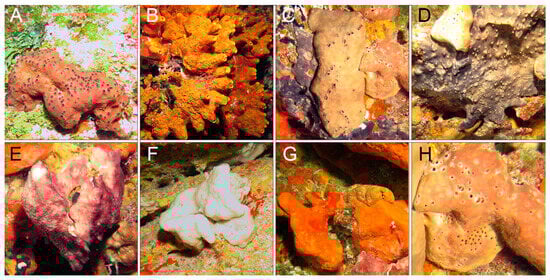 - Moraes, F.C. Esponjas das Ilhas Oceânicas Brasileiras; Série Livros 44; Museu Nacional: Rio de Janeiro, Brazil, 2011; pp. 1–252. [Google Scholar]