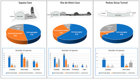 Schematic drawings in lateral views, proportion of species of each sponge class inside the caves and the tunnel studied (pie charts—all zones summed up), and number of species of each class in different zones inside and outside the cavities (bar charts).