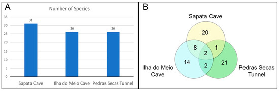 Comparison of the whole sponge communities living inside the three submarine cavities studied on Fernando de Noronha. (A) Species richness. (B) Venn diagram.