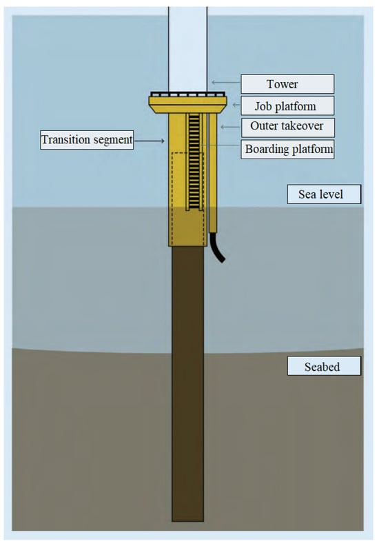 A monopile foundation consists of welded steel tubes made of rolled steel plates, and the tower is supported directly by the foundation pile legs or by connecting the two through a transition section. The structure of a monopile foundation is shown in Figure 4. The pile legs are inserted below the seabed and the depth of insertion depends on the actual environmental loads and the geological conditions of the seabed. The typical single foundation diameter is 3–8 m [5]. Chinese companies typically use 4.5–9 m diameter steel pipes for subsea installations. Monopile foundations are usually applied to shallow water depths, ranging from 0–30 m. In a wind farm of China Three Gorges Group in Dalian City, where the average water depth is 20 m, a large diameter monopile foundation is used as the foundation structure [16].
