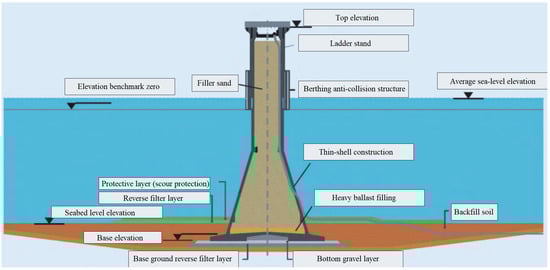 The gravity foundation is one of the main types of offshore wind turbine foundation structures. It mainly rely on the foundation structure and internal ballast weight to resist the overturning moment and sliding force generated by the upper unit and external environment, as shown in Figure 5. This ensures the stability of the foundation and tower structure. It primarily relies on the foundation structure and internal ballast weight to counteract the overturning moment and sliding force generated by the upper unit (wind turbine) and external environmental factors. This ensures the stability of the foundation and tower structure. Gravity foundations are suitable for foundation conditions such as compacted clay and hard rock. However, they are not suitable for soft-foundation seabeds due to the high bearing capacity of the foundation. They are usually applicable to the sea area with water depths of 0–10 m, and some articles think that they can be extended to the sea area with water depths of 0–30 m [16].