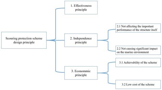In the detailed analysis of the scour protection scheme, it is crucial to prioritize the effectiveness of the designed scheme. Once the effectiveness is ensured, the requirements outlined in principles 2.1 and 3.1 (as shown in Figure 11) should be met. With the above principles satisfied, further consideration should be given to principles 2.2 and 3.2, taking into account the specific conditions of the project and making appropriate trade-offs to achieve optimal results. If the scour protection scheme fails to meet the requirements outlined by the first three principles, it should not be implemented and is considered to be vetoed due to its inability to fulfill the necessary design criteria. This prioritization is illustrated in Figure 12. The order of priority is as follows: principle 1 takes precedence over principles 2.1 and 3.1, which, in turn, take precedence over principles 2.2 and 3.2 (principle (1) > principle (2.1, 3.1) principle (2.2, 3.2)).