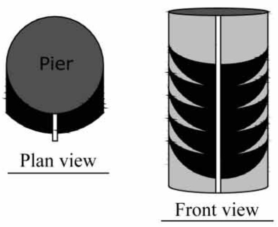 Flow-altering protection schemes can be introduced in the following four major categories, namely: (1) openings through piers, as shown in Table 1; (2) structure attachment, as shown in Table 2; (3) bed attachment, as shown in Table 3; (4) pile alteration schemes, as shown in Table 3.