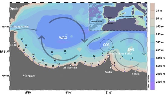 Sampling area and position of stations in the Moroccan Mediterranean Sea. Alboran gyres (WAG, CCG, and EAG) are represented by the gray arrows.
