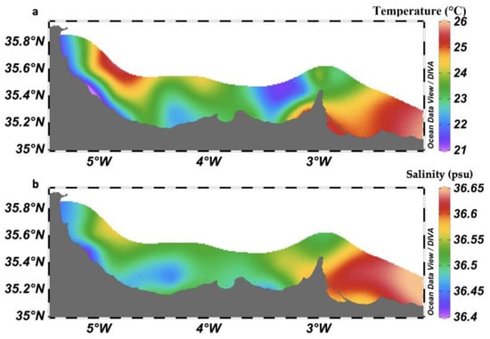 The analyses were conducted using the PRIMER-PERMANOVA + v.6 software package []. At each transect, the horizontal distribution of surface temperature, salinity, and dissolved oxygen was obtained with Ocean Data View software (ODV Version: ODV 5.7.0, []).