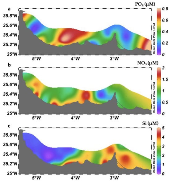 The concentrations of surface nutrients (phosphates and nitrates) were relatively high (Figure 3a,b), increasing in the west of Al Hoceima with values reaching 0.8 µM and 1.8 µM for phosphates and nitrates, respectively. Low concentrations of surface nutrients (silicate) (Figure 3c) were observed in the western region, especially between Al Hoceima and M’diq (<2 µM). The highest values were encountered in the eastern region with a maximum of 4.57 µM.