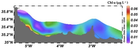The concentration of chlorophyll-a (Figure 4) was very low on the surface with a maximum of 0.063 µg L−1 coastal between M’diq and Al Hoceima, while at depth the values ranged between 0.004 and 0.14 µg L−1 (Figure S2, Supplementary Data). In fact, relatively high concentrations were found in coastal stations located to the west of the study area (with an average surface value of 0.02 µg L−1), which is confirmed by satellite data (Supplementary Materials Figure S1).