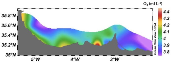 Dissolved oxygen was high throughout the stations (>3.8 mL L−1) with a west–east decreasing trend (Figure 5).