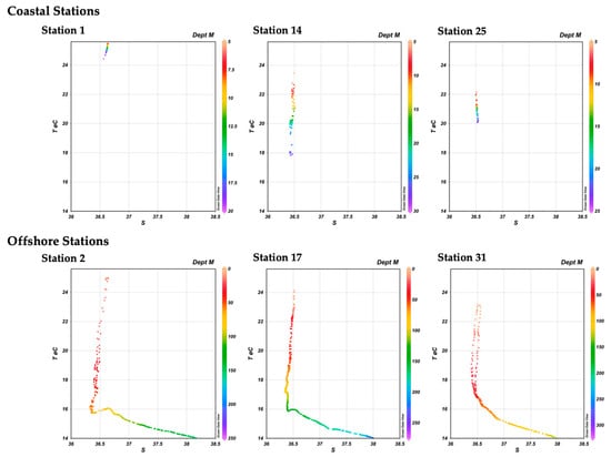 The temperature–salinity diagrams were different from one station to another. They showed a similarity among coastal and offshore stations as shown in Figure 6. Both offshore and coastal stations have a similar value of temperature and salinity in the surface layer. Interestingly, the deeper layers in offshore stations (>200 m) showed temperature and salinity values typical of Mediterranean waters, while coastal stations did not show any stratification (Figure 6).