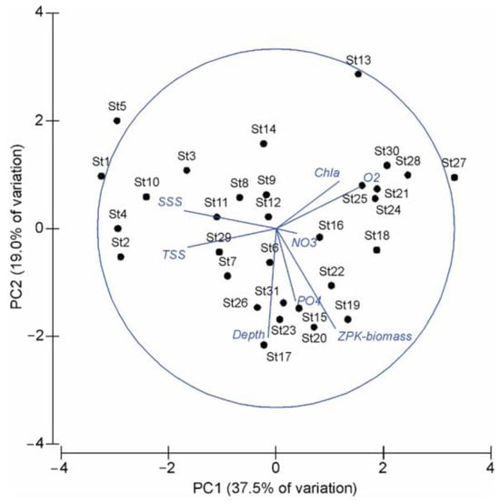 Two-dimensional PCA ordination of environmental variables: sea surface temperature (SST), sea surface salinity (SSS), dissolved oxygen (O2), nitrate (NO3−), phosphate (PO4−), chlorophyll-a surface concentration (Chl-a), and zooplankton wet weight biomass (ZPK-biomass). PC1 and PC2 account for 56.5% of the total variance.