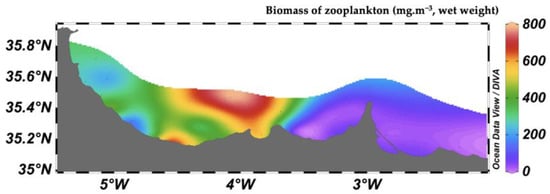 The zooplankton community of the western Moroccan Mediterranean coast is more abundant; this result has been confirmed by Berraho et al. (2016) [], where they found high copepod abundances. High phytoplankton biomass [] was also recorded in this zone. This could be due to the closeness to the Strait of Gibraltar, which creates hydrodynamic movements from the flow from the Atlantic Ocean (Atlantic jet stream). In particular, the highest mesozooplankton abundance observed west of Al Hoceima is associated with the well-defined maximum chlorophyll-a concentration measured. This feature is probably associated with the eastern side of the permanent WAG, which supplies rich, modified Atlantic waters from the Spanish coasts.