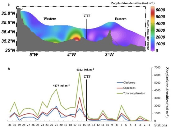 Spatial distribution of (a) total mesozooplankton abundance (ind.m−3) eastward and (b) the abundances of total mesozooplankton, copepods, and Cladocera along the study area. CTF stands for Al Hoceima.