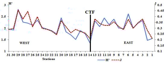 The species richness of copepods along the study area varied from 6 to 13 species. In general, the Shannon index (H’) was >1.5 bits ind−1, and the regularity (J) diversity index was >0.3 with few differences (Figure 10). The maximum values of H’ (2.8 bits ind−1) and J (0.45) were registered in the west at Station 29 (near the M’diq bay). The lowest diversity was observed at Station 14 (H’ = 1.35 bits ind−1 and J = 0.2), characterized by a quasi-dominance of P. parvus, which represented more than 58% of the total copepod population.