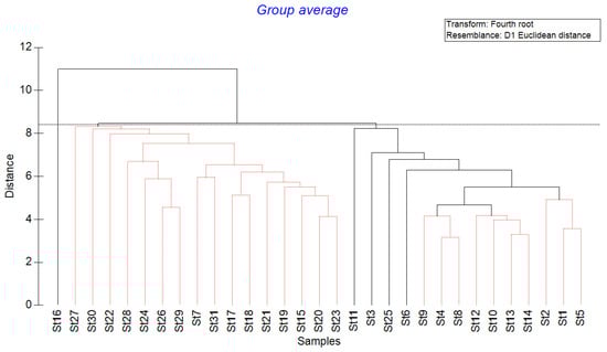 Dendrogram for hierarchical clustering of the zooplankton sampling stations, using group-average linking of Euclidean distance calculated on fourth root transformed abundance data.