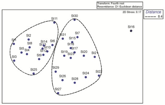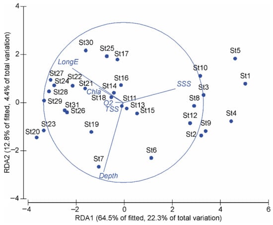 The spatial variation in the structure of the mesozooplankton communities in the study area was described with cluster analysis and non-metric multidimensional scaling (NMDS) as described by Clarke and Warwick (1994) []. Before calculating inter-station resemblances, species abundances for each sampling site were square-root transformed to down-weight abundant species and increase the importance of less-abundant ones. A dissimilarity matrix between stations was constructed based on differences in species composition and abundance using the Euclidean distance. Relationships between the mesozooplankton community composition and environmental parameters were evaluated by distance-based linear modeling analysis (DistLM). Distance-based redundancy analysis (dbRDA) was used to visualize the influence of variables identified by DistLM on the zooplankton community. All environmental parameters were log (x + 1) transformed and normalized, and then the DistLM was run with a dbRDA plot by combining the resemblance matrix (based on Euclidean distance between the abundances of mesozooplankton species in the samples) and the environmental variables. To run DistLM, we chose “Step-wise” as a selection procedure, “AIC” as a selection criterion, and the number of permutations was 999.