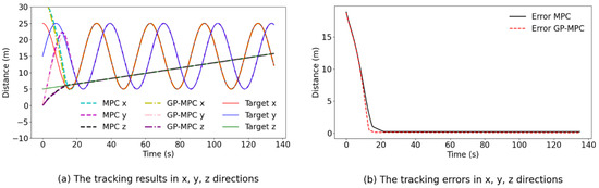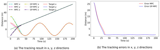 To delve deeper into the results, Figure 4 presents a comprehensive view of the tracking outcomes and errors in the , , and directions over time during the simulation. Figure 4a displays the target and simulated trajectories. Here, the red, blue, and green curves signify the target trajectory in the , , and directions, respectively. The trajectories in the , , and directions of Gaussian-process-based MPC trajectories are represented by the red, blue, and green curves, respectively. The yellow, pink and purple dashed curves represent the trajectories of the MPC method. From Figure 4, it is evident that the MPC and Gaussian-process-based MPC can effectively approach the target trajectory when their initial positions differ, and subsequently form a stable tracking effect. It can be observed from the approach curve during the first 20 s shown in subgraph (a) and the error curve of subgraph (b) that Gaussian-process-based MPC can approach the target curve more stably and quickly. After 20 s, the average tracking error of Gaussian-process-based MPC is , while that of MPC is . Overall, the results demonstrate the effectiveness and accuracy of this algorithm in maintaining good trajectory tracking performance.