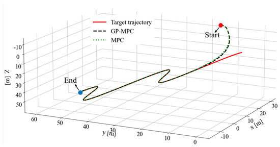 The trajectory tracking task was performed using the proposed algorithm, which leveraged available data and control inputs to guide the AUV’s motion, ensuring the precise tracking of the desired trajectory. The simulation results, depicted in Figure 3, unequivocally demonstrate the algorithm’s effectiveness in achieving accurate trajectory tracking. The red curve in Figure 3 represents the target trajectory, while the black dashed curve illustrates the actual motion trajectory of the AUV with Gaussian-process-based MPC, and the green dotted curve represents the MPC method. The remarkable alignment between these two curves demonstrates the algorithm’s ability to steer the AUV precisely along the intended path.