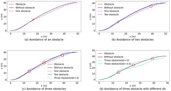 Subsequently, it becomes apparent that different obstacle avoidance results can be achieved by adjusting the observation minimum distance , as illustrated in Figure 7d. When is set to 3 m, the obstacle avoidance trajectory passes through Obs. 5 from the front. An in-depth analysis of this trajectory reveals a key behavior—the AUV endeavors to realign itself with the reference curve once it escapes the influence range of the first obstacle. This realignment is most notable between the second and third obstacles, where the AUV’s path closely aligns with the black reference trajectory. However, due to the short distance between the first and second obstacles, the AUV chooses to maintain a safe distance rather than immediately approach the reference trajectory to satisfy the obstacle avoidance requirements.