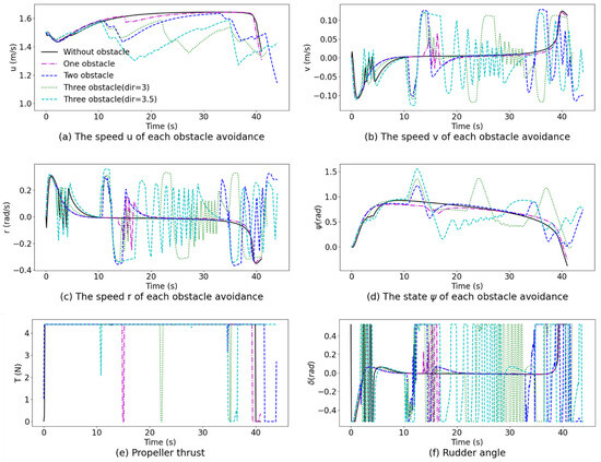 Figure 8 illustrates the translational velocities and , the rotational velocity , the Euler angle , and the input associated with each obstacle avoidance result. The key insights conveyed by the various curves, represented by distinct line types and colors in this figure, align with the interpretations presented in Figure 7.