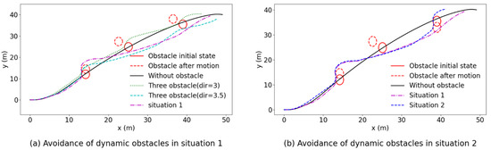 The trajectories of AUV obstacle avoidance under the influence of two types of dynamic obstacles are depicted in Figure 9. In this figure, the red solid ellipses represent the initial position of each dynamic obstacle, while the dashed ellipses denote its position after the movement has ceased. The green dotted curves and cyan dashed curve illustrate the AUV’s avoidance of the three static obstacles discussed in Section 4.2. Furthermore, the magenta dash-dotted curves and blue dashed curves represent the AUV’s avoidance trajectories when confronted with dynamic obstacles in their respective situations.