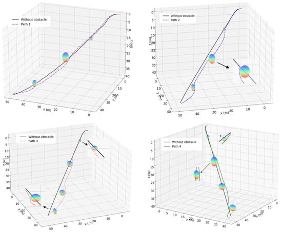 In Figure 7, the red ellipses represent the obstacles that need to be avoided, while the black curves represent the reference trajectory in the absence of obstacles. The magenta dash-dotted curves and blue dashed curves elegantly signify the AUV’s avoidance of one obstacle and two obstacles, respectively. Meanwhile, the green dotted curves and the cyan dashed curve represent the AUV’s impressive ability to avoid three obstacles, each with distinct values of . These findings are a testament to the AUV’s exceptional obstacle avoidance performance, with each subgraph showcasing its agility and precision in various challenging scenarios.