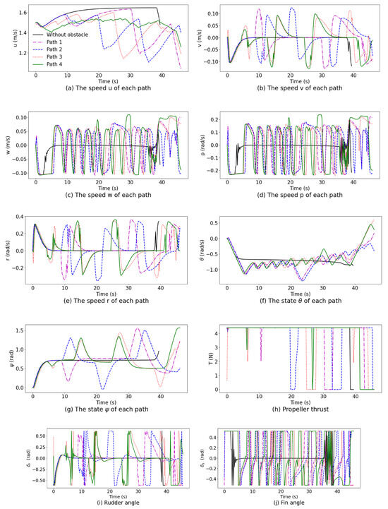 The efficacy of the proposed method in achieving three-dimensional obstacle avoidance for the AUV is substantiated by the results illustrated in Figure 11 and Figure 12. In Figure 11, the AUV obstacle avoidance paths are depicted for four distinct scenarios. The black solid line represents the path without any obstacles, while the magenta dash-dotted curve, blue dashed curve, red dotted curve, and greed curve represent the AUV’s obstacle avoidance trajectories in their respective scenarios. Correspondingly, Figure 12 provides insight into the AUV’s state and input under these four scenarios, maintaining the same representation as in Figure 11. Analyzing the simulation results, it is evident that the proposed method remarkably enables the AUV to adeptly navigate three-dimensional space while avoiding obstacles. Additionally, the AUV’s state variables and input parameters consistently adhere to the specified constraint range throughout the obstacle avoidance maneuvers. It is essential to note that, owing to the disparity between the center of gravity and center of buoyancy in the direction, maintaining the AUV’s stability during movement necessitates significant adjustments in the fin angle during the control process.