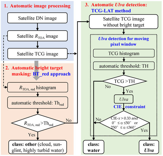The objective of the current study was to introduce an automatic method with local adaptive threshold based on the RTOA-based TCG index (referred to as the TCG-LAT method) for rapid and automated monitoring of Ulva blooms. As illustrated in Figure 1, the workflow for automated Ulva detection comprises the following key components: (1) automatic image processing to obtain satellite RTOA and TCG data from satellite DN data, using simple algebraic operations; (2) automatic detection and masking of Ulva-free bright targets (classified as “other” category, including cloud, sun-glint, and highly turbid water), based on satellite RTOA,red data with the BT_red approach (see Section 2.2.1); (3) window-scale automatic Ulva detection using the proposed TCG-LAT method (see Section 2.2.2); and (4) application of the CIE-FRGB constraint to minimize false positive Ulva classification (see Section 2.2.3). All automatic processes were carried out using MATLAB scripts.