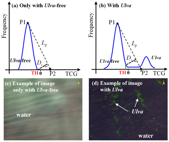 The diagrams for the frequency distribution histogram of TCG: without Ulva (a) and with Ulva pixels (b); the corresponding example of satellite images (c,d).
