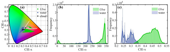 The distribution of the Ulva and Ulva-free pixel samples in the CIE color space (a). Histograms of CIE-α (b) and CIE-x (c) for the Ulva and water pixels.