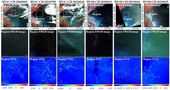 Satellite images of HY1C/D-CZI during 2020 to 2022 (top panel). The FRGB (NIR–red–green) images of the selected sub-images (middle panel), where their locations marked by white boxes were shown in top panel, and their TCG distributions (bottom panel).