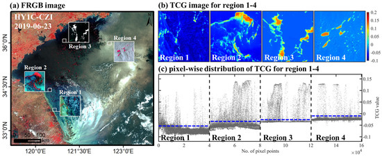 In addition, we specifically selected one HY1C-CZI image on 23 June 2019 to better illustrate the regional differences in the TCG threshold within the same satellite image, as shown in Figure 6. In this analysis, four sub-regions (termed region 1–4; see their locations in Figure 6a) were chosen to represent different background environments. Their RTOA-based TCG values were obtained as shown in Figure 6b, showing that the Ulva features were effectively extracted by the TCG index from Ulva-free features under different background conditions. Figure 6c shows the scatter distributions of TCG values of all pixels in regions 1–4. It was found that the appropriate TCG thresholds for four local regions were different (see the different-colored lines in Figure 6c representing the respective threshold values for regions 1–4). In this case, the global threshold used for the full image would result in misclassifications or omissions of Ulva detection. Overall, it was evident from the results of Figure 5 and Figure 6 that the TCG thresholds should be determined for different satellite images even for sub-images, suggesting the local adaptive threshold of TCG index is necessary for Ulva detection.