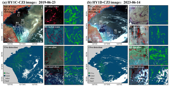 To investigate the method performance on the common and diverse observing conditions (including turbid water, clear water, cloud cover, and sun glint), two satellite images (HY1C-CZI image on 23 June 2021, HY1D-CZI image on 14 June 2023) simultaneously with the above conditions were intentionally used for the case analysis, as shown in Figure 10. Here, for each HY1-CZI image, four sub-images containing Ulva bloom were selected under clear water (R1), turbid water (R2), sun glint (R3), and cloud cover (R4), as shown in middle panel of Figure 10a,b.