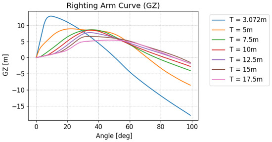 The draught was determined using a basic intact stability study. The GM (metacentric height) values which influence the stability of the platform were calculated at different draughts. The righting arm (GZ) at various draughts (T) was calculated using an open-source tool called BEMRosetta [21,22]. These values are plotted in Figure 2. As mentioned before, the stability rules applicable to FOWTs are still not fully developed, and in the presented study, stability checks were performed using the general IMO stability criteria [8,23] and the MODU (Mobile Offshore Drilling Units) rules [9,24]. The wind turbine was assumed to be kept in a parked–feathered condition to minimise the wind loads on the structure [25]. Even in this turbine configuration, the wind loads could be significant, depending on the wind speed, but it takes dedicated research to understand the effect of wind, which is beyond the scope of this paper.