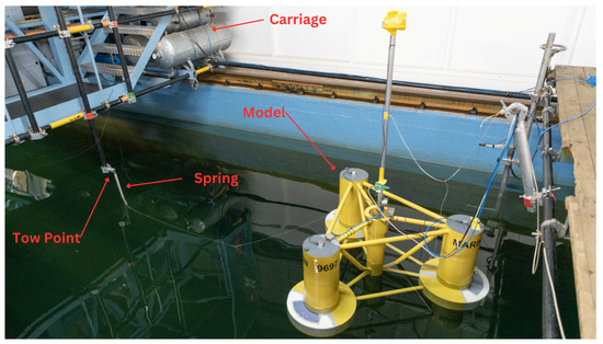 Buttner et al. [11] conducted an experimental investigation to examine the towing process of the Orthospar platform while subjecting it to waves propagating from different directions. Concurrently, they assessed the loading experienced due to the towing line during these experiments. In a separate study, Mas-Soler et al. [12] carried out experiments involving a Tension Leg Platform (TLP) to determine the platform’s towing characteristics across various towing configurations, both in calm waters and under diverse wave conditions. Le et al. [13] analysed the towing performance of two submerged floating offshore wind turbines, evaluating platform motion under varying sea conditions. The study involved calculating maximum values for the heave, pitch and roll and using these to establish limits for towing these platforms based on significant wave height. Additionally, the study derived the bollard pull requirements for different towing scenarios. In another study, Hyland et al. [14] conducted towing tests, assessing the drag prerequisites of the GICON TLP under various operational and towing conditions, and they observed Vortex-Induced Motion (VIM) while towing in calm water.