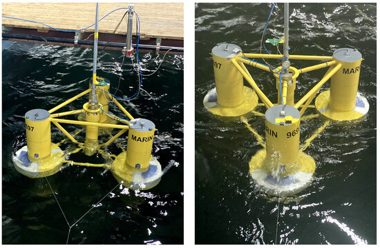 Two configurations/towing setups were tested during the experiments. In configuration 1, a bridle was used for towing. The angle formed at the apex of the bridle, as specified in reference [25], could range between 45 and 60 degrees. For this configuration, a selection of 60 degrees was made. In configuration 2, the towing line was directly connected to the platform. The towing configurations tested during the campaign are shown in Figure 6 and Figure 7. In both configurations, the towing point/points were at the same level as the centre of gravity of the platform, as this was essential to avoid unbalanced moments due to the towline pull.