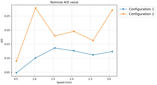 As mentioned before, some oscillatory motion was observed during towing in calm water. To check for VIM, which is a special kind of FIM, the nominal A/D values which represent the amplitude of the motion [30] were calculated and plotted (Figure 9) for both configurations. The nominal A/D value is determined as follows: