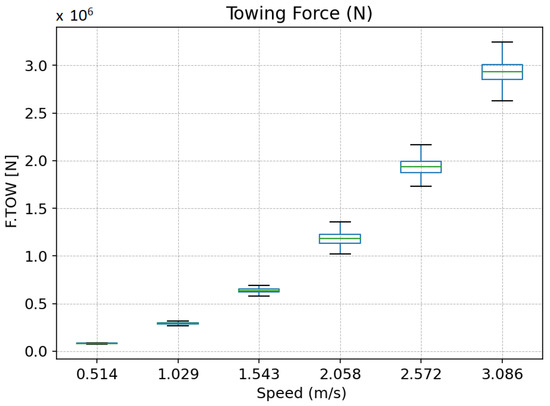 The recorded tension on the towing line during calm water tests is presented and analysed here. This measurement shows the required bollard pull to tow the system at different speeds, and it shows that this value fluctuates according to the speed of towing. The maximum, minimum and mean towing forces were calculated, and they are presented in Table 6. As the speed increased, it was observed that the variation of the towing force also increased. The statistical properties of the values are plotted (Figure 10).