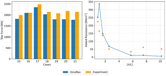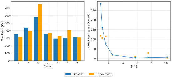 Towing tests were performed for both configurations with various towing speeds and wave conditions. The model was placed in the basin, and the measurement devices were connected to the carriage. Comprehensive checks were performed to ensure the model’s unobstructed movement. The initial stage involved conducting decay tests to determine the natural frequencies of motion, specifically in heave, roll and pitch. The calm water towing tests for speeds ranging from 0.514 m/s to 3.086 m/s were performed for both configurations then to ascertain the drag and, thereby, the bollard pull required for towing in calm water. Fewer tests were carried out for configuration 2, primarily because configuration 1, which employs a bridle, is the most widely employed and recommended towing setup in the offshore industry [25].