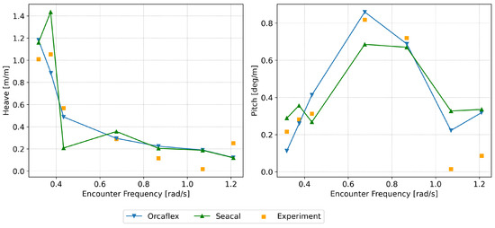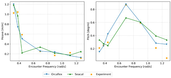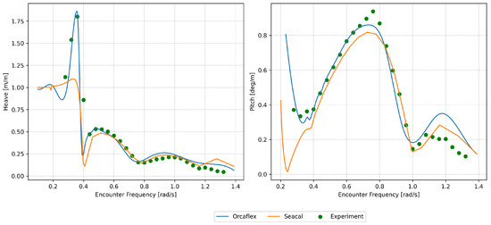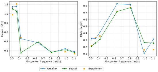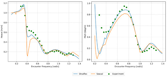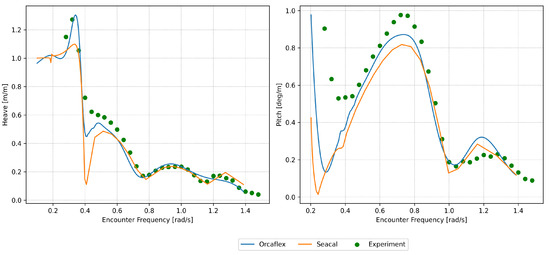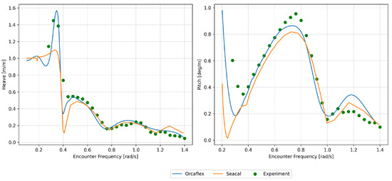 SEACAL is based on zero-speed green functions with a correction for forward speed, depending on the encounter frequency. Low-speed approximations were used while modelling the hydrodynamic motion of the platform. It was assumed that the flow was uniform and equal to the platform’s speed everywhere around the platform. The radiated and diffracted waves were calculated independently of the forward speed; i.e., for all speeds, they were propagating in circles around the platform at zero speed. This method generally gives good predictions for small forward speeds (Fn < 0.25). However, a forward speed of 3.086 m/s (Fn = 0.284) was also investigated, given its slight Froude number proximity to 0.25, to explore the code’s performance at a higher speed. The low-speed approximations hold true only for low values (<0.25) of the Strouhal number (also known as the Brard number), , determined via = U/g [15,35]. While modelling waves and the current together, Orcaflex employs the conventional super-positioning of waves and the current, and it does not take the wave–current interaction into consideration [36]. The effect of the current on a structure is similar to the effect of the forward speed on a vessel [16,35], but in practice, this applies to conditions under which Strouhal numbers are sufficiently low ( < 0.25). This is a limiting condition that applies to both the methods employed in this study. A Strouhal number check was performed to ascertain the frequencies and forward speeds at which the limiting value was exceeded ( > 0.25). This threshold was surpassed when the encountering frequencies were greater than or equal to 1.2 rad/s, 1 rad/s and 0.8 rad/s for forward speeds of 2.056 m/s, 2.572 m/s and 3.082 m/s, respectively. This signifies that the simulation results using these methods may not be accurate for analysing these towing conditions. However, the results are presented from a curiosity perspective and to check how much they deviate from the experimental results.