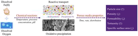 Iron (Fe) is fourth in abundance among the elements in the Earth’s crust [1], and Australia has the largest reserves of Fe ore in the world [2]. Consequently, Fe-containing minerals, such as hematite, magnetite, and goethite, are omnipresent in sedimentary rocks, weathering rinds, mine drainage, and oceanic sands [3]. Fe ions can easily find their way into local groundwater systems either naturally (e.g., by dissolution of Fe-bearing minerals) or via human activities (e.g., industrial effluent and landfill leachate) [4]. In water, Fe is typically present as divalent Fe(II) (i.e., Fe2+ ions) and trivalent Fe(III) (i.e., Fe3+ ions) [5]. As illustrated in Figure 1, when the water also contains dissolved oxygen (DO), Fe(II) is swiftly oxidized to Fe(III) with consecutive precipitation, as iron oxides in aquifers. The precipitation of mineral phases can significantly affect the hydraulic characteristics of the porous media [6]; for example, by changing seepage parameters, including porosity, permeability, or tortuosity. These changes subsequently influence solute transport and chemical reactions within the pore matrix. Therefore, determining the evolution of these parameters and their dependencies is crucial for various environmental, agricultural, and industrial applications [7,8,9,10].