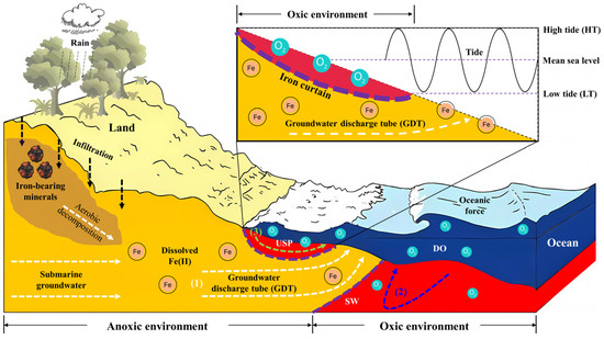 Conceptual model illustrating the hydrological and geochemical processes in the intertidal area [31]. The orange area represents the aquifer zone dominated by submarine groundwater, while the red area shows the seawater intrusion driven by oceanic forces such as tides. Three major processes include (1) submarine groundwater discharge (SGD) (white dashed lines), (2) density-driven circulation (blue dashed lines), and (3) tide-induced circulation (green dashed lines). Between the saltwater wedge (SW) and the upper saline plume (USP), a groundwater discharge tube (GDT) intersects the beach. Moreover, the decomposition of Fe-bearing minerals can lead to the release of Fe ions into groundwater (e.g., facilitated by rainwater infiltration, in black dashed lines). Fe(II)-rich groundwater can be oxidized by DO-rich seawater, and precipitate Fe oxides at the groundwater–seawater interface. The accumulation of these minerals can form the iron curtain which acts as a geochemical barrier (purple dashed lines) in coastal aquifers.