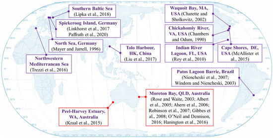 As illustrated in Figure 4, early research revealed the elevated concentration of dissolved Fe(II) in the streams flowing into Deception Bay (northwest end of Moreton Bay), Queensland, Australia [40]. It has been identified as a key factor contributing to the occurrence of Lynbya blooms in the coastal area [41]. Subsequent field studies on the Deception Bay catchment and Caboolture River sub-catchment (Queensland, Australia) discovered that the outcropping sediments contained ironstone and Fe minerals (up to 8.5%). Moreover, discrepancies in the chemical compositions of leachate and shallow groundwater indicated that the groundwater flowing through this region had a source other than surface waters [42,43]. Meanwhile, the report on samples from the intertidal area off Sandstone Point, Queensland, Australia, showed that the soil had an acidic pH level ranging from 4.6 to 5.2 at a depth of 0.2 m and was highly acidic, with a pH below 3.4 at depths between 1 m and 1.2 m [42,44]. These findings indicate the presence of acid sulfate soils (ASS), which are widespread in the coastal regions of Queensland. When these soils undergo hydromechanical disturbances, such as from agriculture and construction, the exposed sulfides react with oxygen in the air to form sulfuric acid, which leads to the decomposition of Fe minerals [43] and the subsequent release of Fe(II) into groundwater systems (see Figure 2) [4]. As a result, soil samples from the top layer (up to 0.3 m) contained a moderate content of extractable Fe, with levels reaching 91 mg/kg, while the groundwater had a high Fe(II) concentration of up to 1.6 mg/L. This implies that significant amounts of groundwater at depth delivered Fe(II) through the soil to the neighboring intertidal area of Deception Bay [44]. Furthermore, detailed measurements of Fe(II) concentrations obtained by incubating sediment cores from northern Deception Bay provided evidence of the benthic release of Fe(II) at the sediment–seawater interface in an intertidal area [45]. In comparison, on the east side of Moreton Bay, field measurements of porewater salinity and DO profiles on the west coast of Moreton Island (Mulgumpin) presented a conceptual model of the coastal unconfined aquifer (CUA) driven by oceanic oscillations, particularly tides and waves [23,46]. The results revealed significant geochemical zonation, that strongly influenced the fate and distribution of reactive chemicals at the groundwater–seawater interface, as well as their subsequent discharge to coastal waters. Furthermore, chemical analysis of porewater samples from an offshore site of Eastern Banks in North Stradbroke Island (Minjerribah) indicated that dissolved Fe in groundwater primarily existed in the form of Fe(II), and it also demonstrated the presence of a higher Fe(II) concentration compared to that in seawater [47]. As a supplement, an in-depth assessment of phosphorus (P) cycling in the sediments of the Peel–Harvey Estuary, Western Australia, suggested that P was adsorbed onto micro-scale enrichments of Fe(III) oxyhydroxide due to Fe redox chemistry [48].