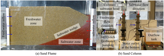 Schematic illustration of (a) a sand flume and (b) a sand column which were previously used in the Geomechanics Research Laboratory at the University of Queensland (UQ), Queensland, Australia. A sand flume test can be used to investigate pathways and mechanisms under various predetermined forcing circumstances, such as different tidal ranges and net groundwater flow rates, while a sand column test can be typically utilized to explore the migration of certain compounds in a particular substrate. Note that blue arrows show freshwater flow direction, while red arrows represent saltwater flow direction.