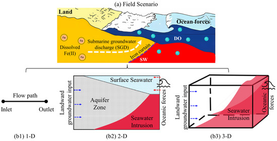 Illustration of (a) field scenario and corresponding numerical simulations using (b1) 1-D model, (b2) 2-D model, and (b3) 3-D model. In the field scenario, the orange represents the groundwater aquifer zone, while the red represents the seawater intrusion zone. Groundwater-derived Fe(II) can be oxidized by DO and then precipitate as Fe oxides, which creates an iron curtain (purple dashed lines) at the groundwater–seawater interface. The 1-D model features a simple reaction network along the flow path. The 2-D model can be utilized to investigate groundwater flow and biogeochemical reactions in the cross-shore direction of intertidal areas. Meanwhile, the 3-D model is suitable for investigating the variation of groundwater flow and solute transport in the alongshore direction of coastal aquifers. Note that blue arrows show groundwater flow direction, while red arrows represent seawater flow direction.